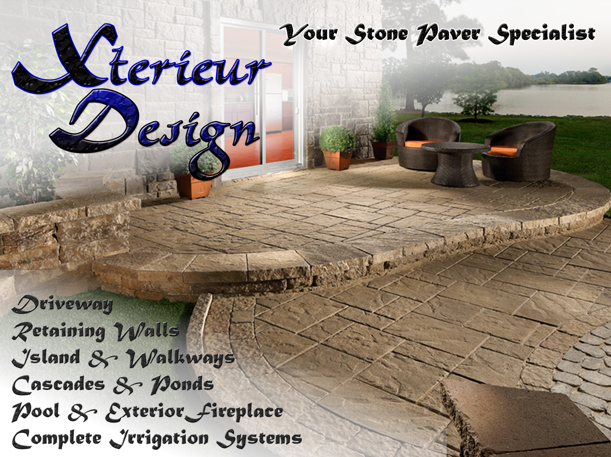 Home PageABOUT US, Our Mission and Values, Xterieur Design Paving Stone SpecialistXterieur Design, Pictures of projects, retaining walls, driveway, paving stones, stone walkway, waterfalls, ponds & water gardens, irrigation Rainbird, swimming pool, outdoor fireplace, rock gardenDid you know that... difference between stone pavers vs asphalt, make the right choiceContact Xterieur Design, contact us, email info@xterieurdesign.ca